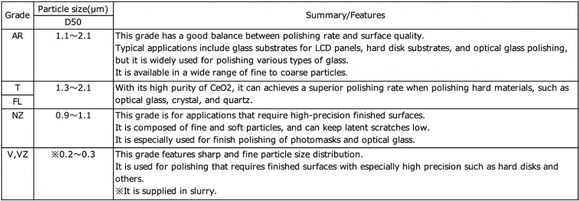 SHOROX is CeO2 abrasive for finishing various glass materials including optical glass, and crystal materials such as quartz.