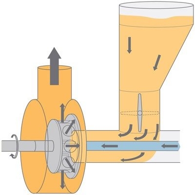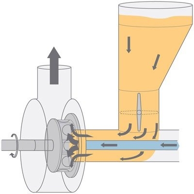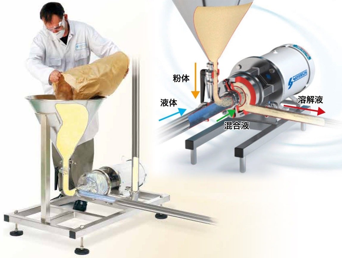 By opening the butterfly valve of the hopper containing the powder, the powder is drawn into the liquid stream and sucked into the workhead.