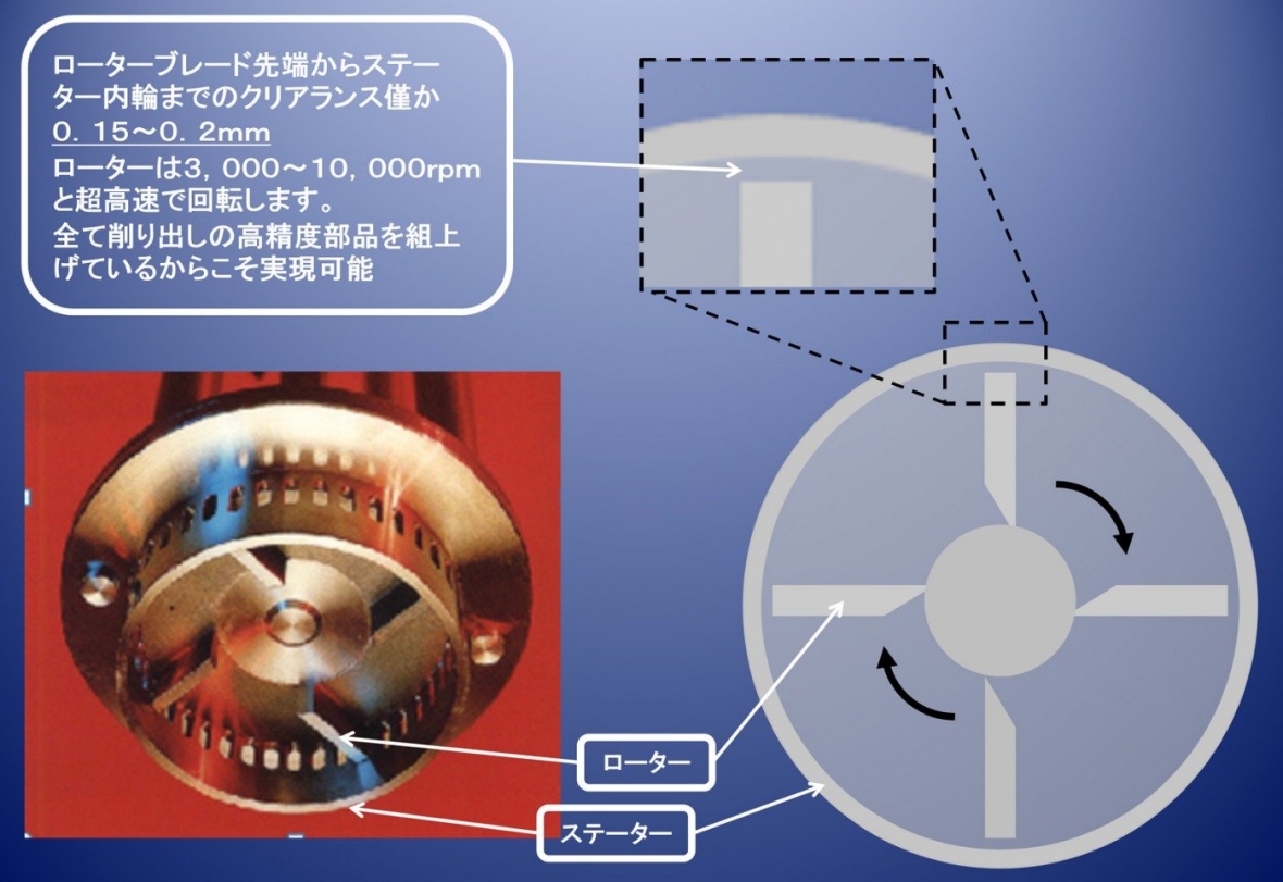 Liquids and solids sucked into the workhead are pushed outward due to the centrifugal force created by the rotation of the rotor, and are strongly sheared as they pass through the small clearance between the rotor and stator.