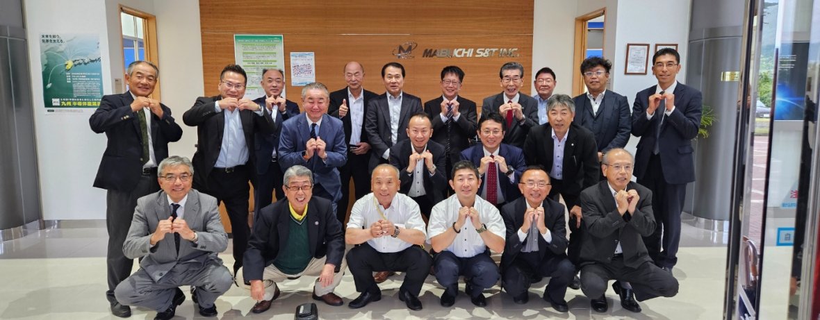 2024年06月19日(水) 花阪組の皆様が来社されました! 九州を主体とするものづくり企業経営者会である花阪組の皆様が来社され、勉強会が行われました。 あいにく当日は朝から雨でしたが、来社される頃には小降りになり、お帰りになるころには回復しました。 写真のポーズはマブチの「M」です!