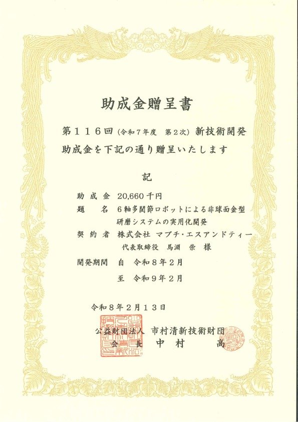 2026年02月16日(月) 公営財団法人 市村清新技術財団様より助成金を賜りました。 このたび、公営財団法人 市村清新技術財団様より助成金を賜りました。 本助成は、当社の「6軸多関節ロボットによる非球面金型研磨システムの実用化開発」に対し、 その革新性および将来性をご評価いただいたものです。 賜りましたご支援を有効に活用し、技術のさらなる高度化と実用化の推進を通じて、 より一層社会に貢献できるよう取り組んでまいります。 この場をお借りして、心より御礼申し上げます。