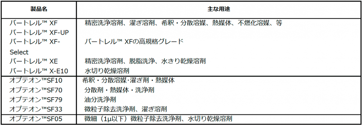 フッ素系特殊溶剤 バートレル™シリーズ、オプテオン™SFシリーズ バートレル™シリーズは安全性、環境特性のバランスを持つHFC系フッ素系特殊溶剤です。 更に、持続可能な未来に向けた地球環境保護を目指し、極低地球温暖化係数を実現した次世代のHFO系フッ素系溶剤がオプテオン™シリーズです。 特徴 環境特性、安全性、洗浄機能、経済性がバランス良く調和している洗浄剤 一般的な洗浄剤(炭化水素系)の濯ぎ洗浄に使用することで、高品質の洗浄が可能 精密部品の細かいゴミ(微粒子)の除去に 油やフラックス洗浄用途として、精密部品の油除去や基板のフラックス除去 水切り(ガラス)用途として水で洗浄後に瞬間的に水を乾かす用途